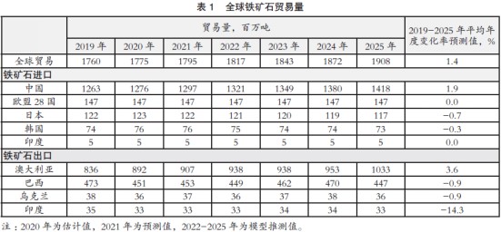 由于中國對空氣污染的控制,鐵礦石需求可能在一定程度上受到限制。中國港口鐵礦石卸貨速度也顯著低于上年,這主要是受新冠肺炎疫情的影響。全球鐵礦石貿(mào)易量如表1所示。