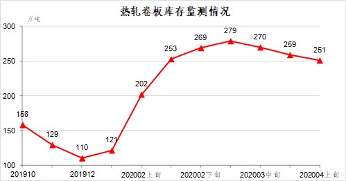4月上旬,熱軋卷板庫(kù)存251萬(wàn)噸,比上一旬減少8萬(wàn)噸,下降3.0%;比上年12月增加141萬(wàn)噸,上升128.2%。