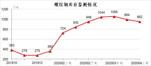 4月上旬,螺紋鋼庫(kù)存952萬(wàn)噸,比上一旬減少42萬(wàn)噸,下降4.2%;比上年12月增加677萬(wàn)噸,上升246.2%。