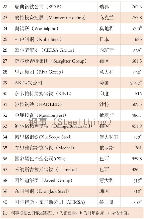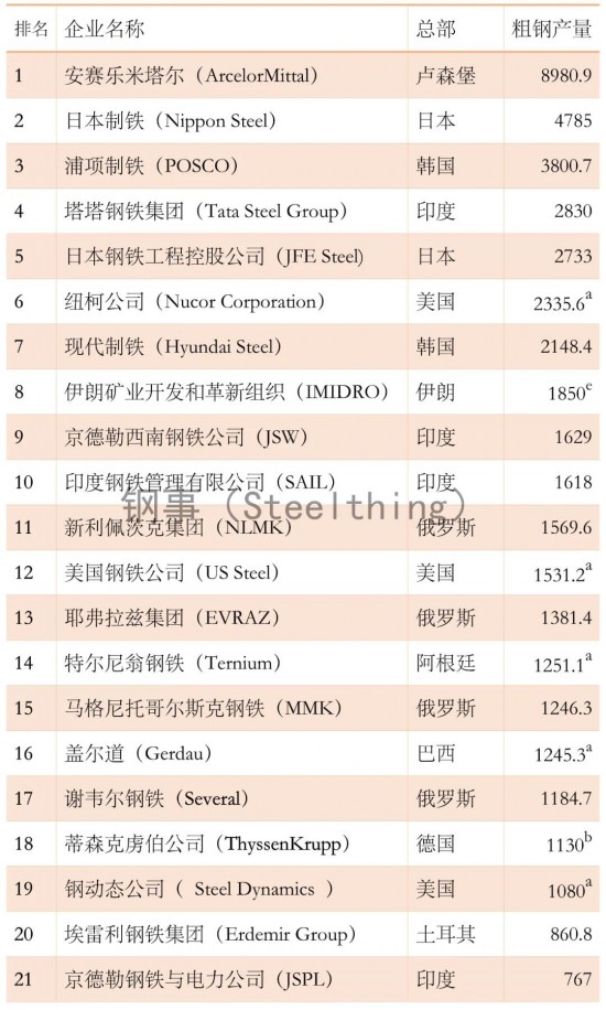 據(jù)不完全統(tǒng)計(jì),2019年,粗鋼年產(chǎn)量超過(guò)300萬(wàn)噸的40家國(guó)際鋼鐵生產(chǎn)企業(yè)粗鋼總產(chǎn)量約為5.6億噸(排名和產(chǎn)量見(jiàn)下圖),占2019年除中國(guó)(含臺(tái)灣)之外的世界其他63個(gè)產(chǎn)鋼國(guó)粗鋼總產(chǎn)量的比例為66%。