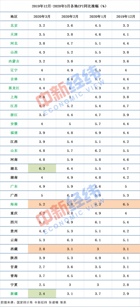 廣西、海南、四川、云南5省份3月CPI同比漲幅“破5”;上海、西藏、甘肅、寧夏、新疆3月份CPI處于“2時代”,新疆同比漲幅最低,為2.4%。