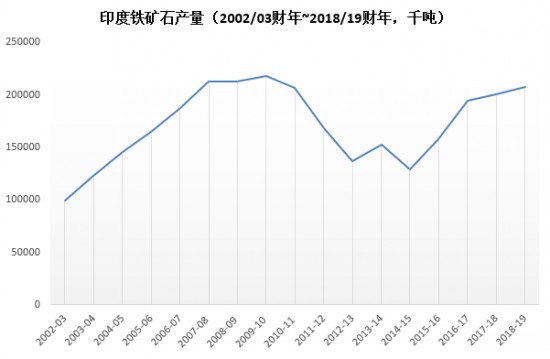 從生產(chǎn)方面來看,印度截止2020年3月31日的2019/20財(cái)年的鐵礦石產(chǎn)量預(yù)計(jì)將創(chuàng)歷史新高,超過2.2億噸,之前的高位為2009/10財(cái)年的2.18億噸,2018/19財(cái)年產(chǎn)量為2.07億噸。