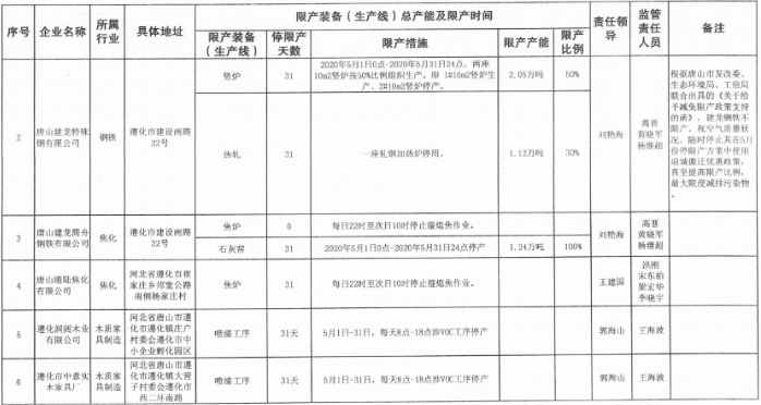 近日,河北省唐山市各地方政府陸續(xù)發(fā)布《5月份空氣質(zhì)量強(qiáng)化管控期間停限產(chǎn)調(diào)度安排表》,鋼企方面,涉及津西、建龍、瑞豐、東華、凱恒、經(jīng)安等多家鋼企,限產(chǎn)產(chǎn)能達(dá)142萬噸。焦化方面,涉及達(dá)豐、港陸、建龍焦化影響程度不一。具體明細(xì)如下:
