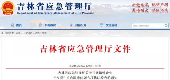 5月7日,吉林省應急管理廳發(fā)布文件表示,為進一步推動鋼鐵企業(yè)落實安全生產(chǎn)主體責任,深入排查治理企業(yè)“八項”重點隱患問題,有效防范鋼鐵企業(yè)典型生產(chǎn)安全事故發(fā)生,定于2020年5月6日至6月30日,在全省開展鋼鐵企業(yè)“八項”重點隱患問題專項執(zhí)法檢查行動。