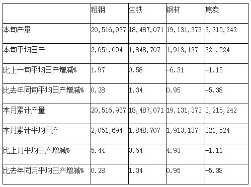 根據(jù)重點(diǎn)統(tǒng)計(jì)鋼鐵企業(yè)產(chǎn)量估算,本旬全國共生產(chǎn)粗鋼2724.28萬噸,日產(chǎn)粗鋼272.43萬噸、環(huán)比增長1.67%、同比下降4.56%;生產(chǎn)生鐵2280.73萬噸,日產(chǎn)生鐵228.07萬噸、環(huán)比增長0.41%、同比下降3.61%;生產(chǎn)鋼材262.39萬噸,日產(chǎn)鋼材326.24萬噸、環(huán)比下降1.35%、同比下降1.55%。本月累計(jì)平均日產(chǎn),全國粗鋼環(huán)比增長2.31%、同比下降4.56%,生鐵環(huán)比增長1.28%、同比下降3.61%,鋼材環(huán)比增長1.13%、同比下降1.55%。