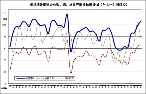[1] 受鞍鋼集團(tuán)ERP取數(shù)原則和部分企業(yè)月底集中入庫等因素影響,本旬鋼材產(chǎn)量相比上一旬減少較多。剔除這些因素,本旬鋼材產(chǎn)量相比上一旬下降3.50%左右。(中國鋼鐵工業(yè)協(xié)會(huì))
