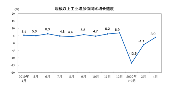 2020年4月份,規(guī)模以上工業(yè)增加值同比實(shí)際增長3.9%(以下增加值增速均為扣除價(jià)格因素的實(shí)際增長率),上月為下降1.1%。從環(huán)比看,4月份,規(guī)模以上工業(yè)增加值比上月增長2.27%。1-4月份,規(guī)模以上工業(yè)增加值同比下降4.9%。