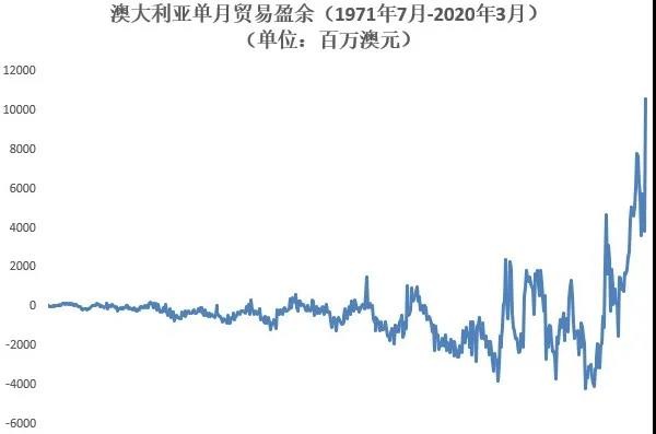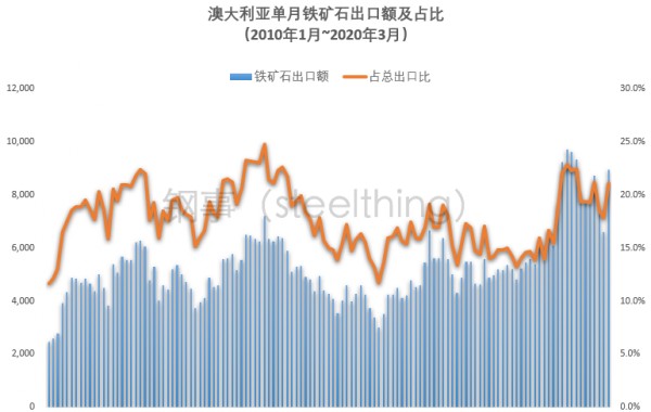 3月份,澳大利亞出口額環(huán)比增加了55.58億元,至424.17億澳元,增幅為15%;其中鐵礦出口額為89.46億澳元,環(huán)比增加35%,為23.68億澳元,貢獻了澳大利亞當(dāng)月出口43%的增量。最近的2019年,ABS的數(shù)據(jù)顯示,其出口額為4928.84億澳元,比2018年增加了545.6億元;其中鐵礦石出口額為962.08億澳元,增加了328.69億澳元,占出口增量的60%??梢哉f,鐵礦石對澳大利亞的經(jīng)濟和貿(mào)易至關(guān)重要。事實上,鐵礦石一直以來都是澳大利亞出口額最大的品種,沒有之一,出口額占澳大利亞總出口額的比例長期在15%~20%之間,最高時接近30%,今年3月份占比為21%。第一季度,澳大利亞貿(mào)易盈余大幅回升至195.13億澳元。如果扣除鐵礦石,那澳大利亞第一季度將由貿(mào)易盈余195億澳元轉(zhuǎn)為貿(mào)易赤字33.26億澳元。