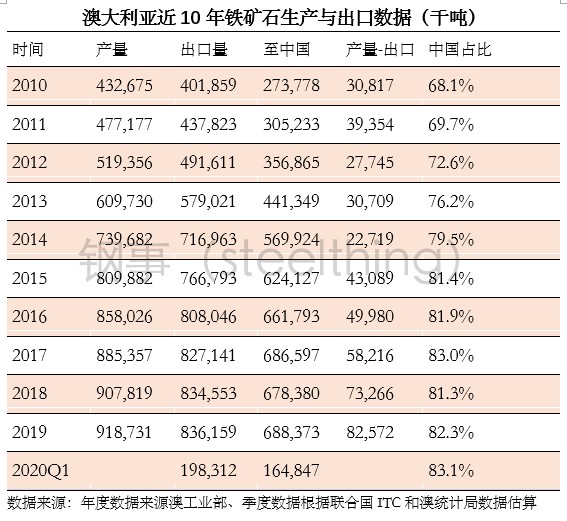 此外,鐵礦石方面,中澳是相互依賴的關(guān)系,實際上澳大利亞更依賴中國。從過去10年的數(shù)據(jù)來看,澳大利亞鐵礦石的產(chǎn)量和出口量均保持增長,出口中國的占比由2010年的68%上升至去年的82%,提高了14個百分點。中國2019年自澳大利亞的進口占總進口量的比例為62%。同時,澳大利亞鐵礦石的產(chǎn)量高于出口量的幅度也在不斷增加,2019年達到8257萬噸,2010年時為3082萬噸(見下圖),多出的鐵礦石去哪了?澳大利亞2019年粗鋼產(chǎn)量為549.3萬噸,生鐵產(chǎn)量為366.4萬噸,國內(nèi)對鐵礦石的需求非常小。