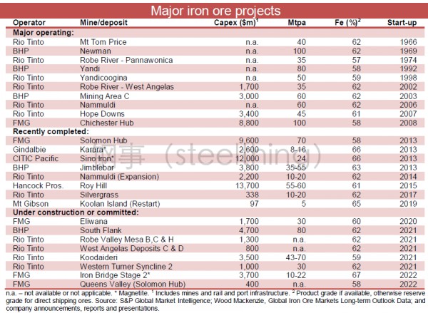 也正是因為鐵礦石的“暴利”屬性,各礦山企業(yè)還在擴大產(chǎn)能,這也符合資本逐利的本質(zhì)和市場經(jīng)濟的特點。根據(jù)西澳州礦業(yè)部發(fā)布的數(shù)據(jù)(見下圖),澳大利亞今明兩年在建或計劃將建設(shè)的鐵礦石項目年產(chǎn)能接近2億噸。