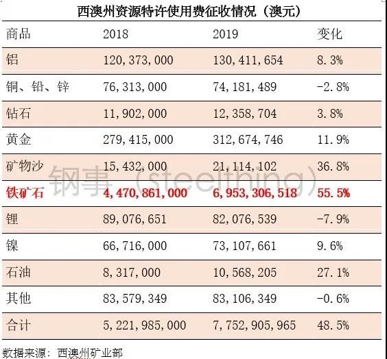 根據(jù)西澳州發(fā)布的數(shù)據(jù),澳大利亞99%的鐵礦石產(chǎn)自西澳州,鐵礦石收入占該州生產(chǎn)總值的20%。2019年,鐵礦石出口額占西澳州商品出口總額的53%,占礦產(chǎn)品出口額的76%。2019年,西澳州鐵礦石資源特許權(quán)使用費近70億澳元,同比增加55.5%(見下圖),占西澳資源特許使用費的比例為82%,占西澳州政府收入的18%。