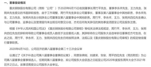 6月16日晚間,重慶鋼鐵發(fā)布公告,由于工作調(diào)整,周竹平辭去公司董事長、董事及第八屆董事會中其他職務(wù),李永祥、王力、張朔共分別辭去公司董事及第八屆董事會中其他職務(wù)。