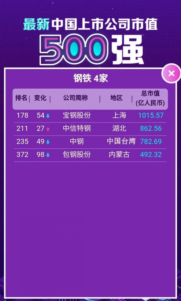 近日,21財(cái)經(jīng)發(fā)布了最新的中國(guó)上市公司市值500強(qiáng)。截至2020年6月30日,在上海、深圳、香港、紐約等全球15個(gè)交易所上市的中國(guó)上市公司共計(jì)7425家(已剔除退市公司)。其中,中國(guó)500強(qiáng)上市公司總市值75.02萬(wàn)億。本次500強(qiáng)榜單入圍門檻355.58億元,相比去年底提高28.74億元。在鋼鐵行業(yè)中,共有4家上市鋼企進(jìn)入本次中國(guó)上市公司市值500強(qiáng)榜單(如下圖)。其中,寶鋼股份以1015.57億的市值位列鋼鐵行業(yè)第一位、總榜第178位。