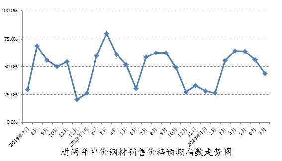 據(jù)對(duì)全國(guó)重要鋼材批發(fā)市場(chǎng)調(diào)查,7月鋼材批發(fā)市場(chǎng)銷(xiāo)售價(jià)格預(yù)期指數(shù)、購(gòu)進(jìn)價(jià)格預(yù)期指數(shù)分別為43.8%、50.9%,比上月分別下降12.6和3.3個(gè)百分點(diǎn),反映出市場(chǎng)心態(tài)趨于謹(jǐn)慎,對(duì)7月份鋼材價(jià)格特別是銷(xiāo)售價(jià)格走勢(shì)預(yù)期轉(zhuǎn)弱。