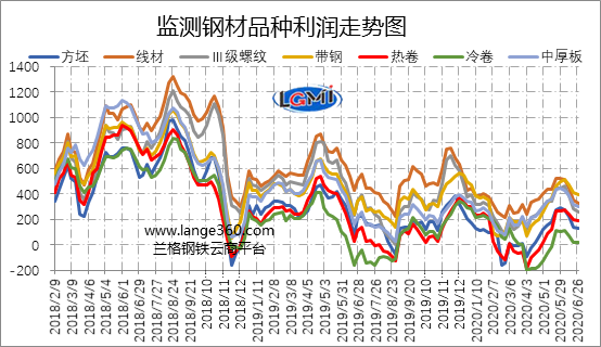圖2是蘭格鋼鐵云商平臺監(jiān)測的各主要鋼材品種的盈利能力曲線對比。從圖2可以看出,6月份7大品種測算毛利呈波動下降趨勢,但因建材消費淡季來臨,下游建筑工地采購逐步放緩,6月市場走勢呈現(xiàn)“長弱板強”格局,各品種盈利均值與上月同期相比表現(xiàn)有所分化,鋼坯和建材品種盈利下降,板材品種除中厚板外盈利均有上升。上升品種中,熱軋卷板毛利上升最多,為39元/噸,帶鋼和冷軋卷板毛利分別上升33元/噸和20元/噸;下降品種中,線材毛利下降最多,為71元/噸,其他品種毛利降幅在33-48元/噸之間。
