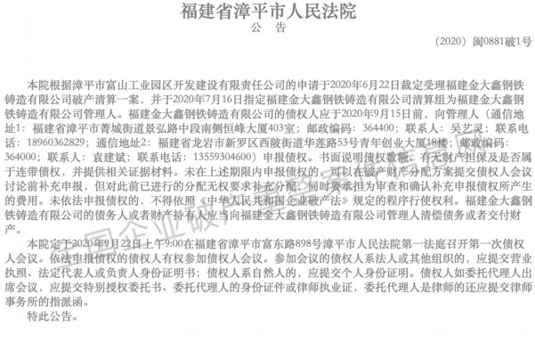 2020年7月17日,福建省漳平市人民法院發(fā)布公告:本院根據(jù)漳平市富山工業(yè)園區(qū)開發(fā)建設(shè)有限責(zé)任公司的申請于2020年6月22日裁定受理福建金大鑫鋼鐵鑄造有限公司破產(chǎn)清算一案,并于2020年7月16日指定福建金大鑫鋼鐵鑄造有限公司清算組為福建金大鑫鋼鐵鑄造有限公司管理人。