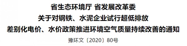 根據(jù)國家發(fā)展改革委《關(guān)于創(chuàng)新和完善促進(jìn)綠色發(fā)展價(jià)格機(jī)制的意見》(發(fā)改價(jià)格規(guī)﹝2018﹞943號)、河南省人民政府辦公廳《關(guān)于完善差別化電價(jià)政策的通知》(豫政辦明電﹝2018﹞99號)及《河南省鋼鐵行業(yè)超低排放改造實(shí)施方案》(豫環(huán)文〔2019〕211號)、《河南省水泥行業(yè)超低排放改造實(shí)施方案》(豫環(huán)攻堅(jiān)辦〔2020〕24號)等文件規(guī)定,為推動(dòng)重點(diǎn)行業(yè)大氣污染物減排,持續(xù)改善環(huán)境空氣質(zhì)量,經(jīng)省政府同意,決定對全省鋼鐵、水泥企業(yè)試行超低排放差別化電價(jià)、水價(jià)政策?,F(xiàn)將有關(guān)事項(xiàng)通知如下:
