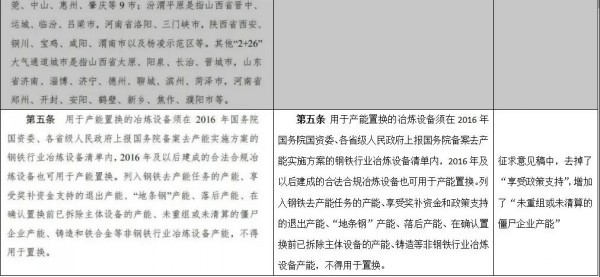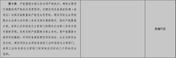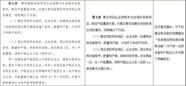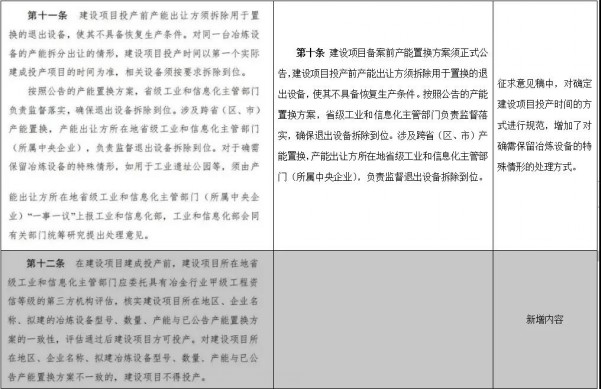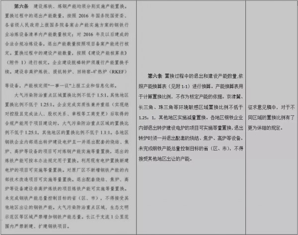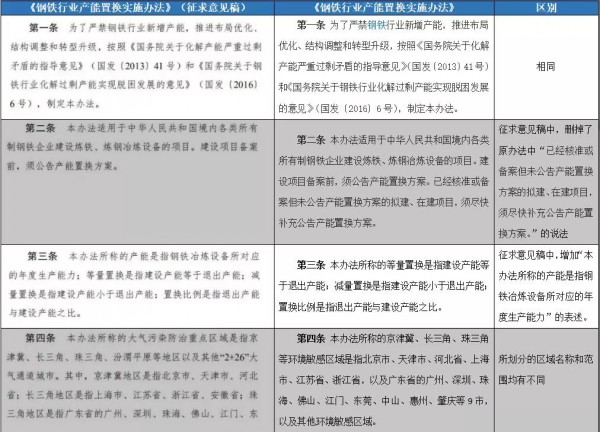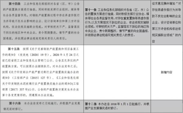 從該通知看到,《鋼鐵行業(yè)產(chǎn)能置換實施辦法》(征求意見稿)與2018年1月工信部印發(fā)的《鋼鐵行業(yè)產(chǎn)能置換實施辦法》相比,條數(shù)從12條增加到了16條,具體內(nèi)容上也有較多不同之處,如下表所示: