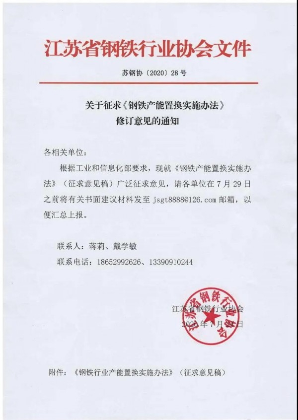 7月24日,江蘇省鋼鐵行業(yè)協(xié)會發(fā)布關(guān)于征求鋼鐵產(chǎn)能置換實施辦法修訂意見的通知。