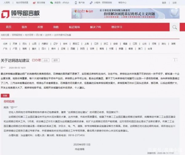8月13日,達(dá)州市經(jīng)信局在人民網(wǎng)地方領(lǐng)導(dǎo)留言板上回復(fù)網(wǎng)友的來信稱:達(dá)鋼搬遷優(yōu)化選址順利完成,項(xiàng)目選址達(dá)川區(qū)麻柳鎮(zhèn)論證報(bào)告已通過專家評(píng)審,并報(bào)請(qǐng)省政府支持達(dá)鋼搬遷工作專班同意。