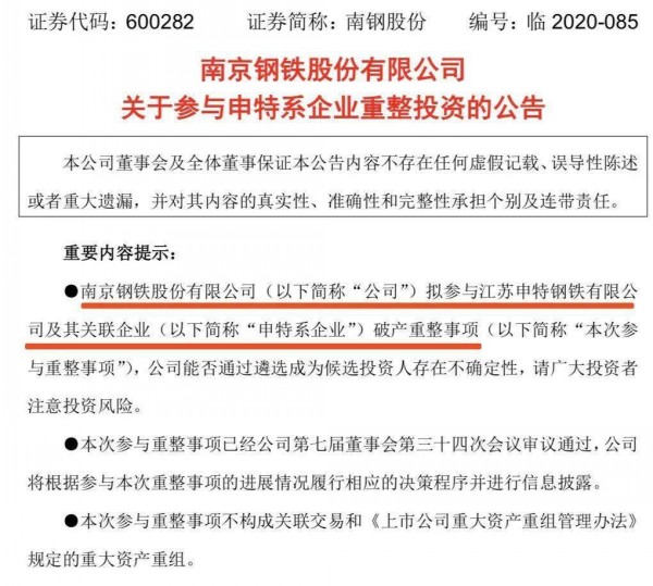 這次南鋼股份公告擬參與重整申特鋼鐵,有兩種可能,一種是方大特鋼大股東方大鋼鐵雖然之前有意,但已經(jīng)放棄重整申特;另一種可能也不排除引入競爭,不過南鋼與申特均為江蘇省內鋼企,可能更有優(yōu)勢。