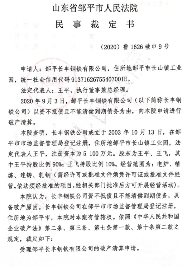 2020年9月6日,全國(guó)企業(yè)破產(chǎn)重整案件信息網(wǎng)發(fā)布《鄒平長(zhǎng)豐鋼鐵有限公司破產(chǎn)清算申請(qǐng)-公告》。