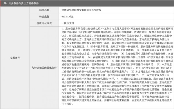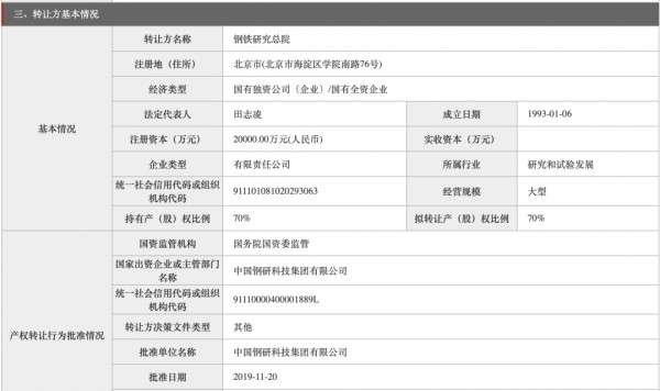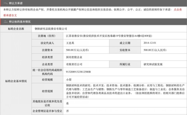 9月9日,根據(jù)北京產(chǎn)權(quán)交易所消息,鋼鐵研究總院掛牌出售鋼鐵研究總院淮安有限公司70%的股權(quán),轉(zhuǎn)讓底價(jià)為413.91萬(wàn)元。鋼鐵研究總院淮安有限公司成立于2014年,該公司主營(yíng)鋼鐵材料技術(shù)的研究、技術(shù)開(kāi)發(fā)、技術(shù)咨詢、技術(shù)服務(wù)等。