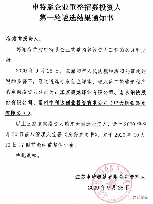 2020年9月26日,在溧陽市人民法院和溧陽公證處的現(xiàn)場監(jiān)督下,經(jīng)過遴選專家獨(dú)立評(píng)審,進(jìn)入第二輪遴選程序的意向投資人分別為:江蘇德龍鎳業(yè)有限公司、南京鋼鐵股份有限公司、常州中利達(dá)創(chuàng)業(yè)投資有限公司(中天鋼鐵集團(tuán)有限公司)。