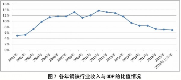 2020年上半年鋼鐵行業(yè)收入與GDP的比值降至6.98%,僅高于2001年、2002年,表明鋼鐵行業(yè)在抗擊疫情過程中,以較低的鋼材價格(CSPI100點左右)支撐了固定資產(chǎn)投資的快速恢復(fù)和部分制造行業(yè)的復(fù)工復(fù)產(chǎn)。