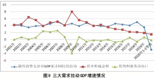 據(jù)圖9可知,2001年~2013年,資本形成總額拉動GDP累計同比增長的幅度基本都高于最終消費支出(2005年、2007年除外),表明此階段資本形成總額是拉動GDP增長的首要動力。2013年~2019年,最終消費支出拉動GDP增長幅度高于資本形成總額,表明此階段最終消費是拉動GDP增長的首要動力。