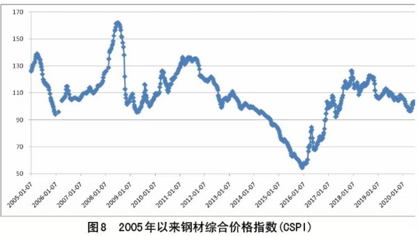 由圖7可知,2001年~2011年,鋼鐵行業(yè)收入與GDP的比值呈現(xiàn)逐年上升的態(tài)勢,而這些年鋼材價格始終保持在較高水平,如鋼材綜合價格指數(shù)(CSPI)基本都保持在110點以上(見圖8)。2012年至今,鋼鐵行業(yè)收入與GDP的比值呈現(xiàn)逐年下降的態(tài)勢,這主要源于這些年鋼材產(chǎn)量雖然保持增長,但鋼材綜合價格指數(shù)(CSPI)基本都保持在110點以下,整體低于2005年~2011年的水平,這意味著鋼鐵行業(yè)以較低的鋼材價格支撐了下游行業(yè)的發(fā)展,并由鋼鐵行業(yè)自身承擔(dān)了鐵礦石價格上漲的成本,這也是鋼鐵行業(yè)對整個國民經(jīng)濟的貢獻(xiàn)。我們很難想象如果鋼材價格自2012年起一直保持2011年的水平,汽車、造船等制造行業(yè)還能否在這些年里保持如此快速的發(fā)展,房地產(chǎn)、建筑業(yè)還能否擁有如此高的盈利空間。