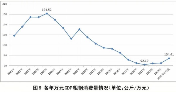 據(jù)圖6可知,2005年萬元GDP粗鋼消費量達(dá)到近20年的峰值;2006年~2017年,萬元GDP粗鋼消費量呈現(xiàn)逐年下降的態(tài)勢,2017年降至近20年最低值;2018年至今,萬元GDP粗鋼消費量呈現(xiàn)逐年回升的態(tài)勢,2020年上半年已經(jīng)回升至104.41公斤/萬元,已經(jīng)超過了2015年的水平。這表明2018年以來,我國在GDP增長結(jié)構(gòu)上還是較為倚重基建投資增長,而基建投資的萬元投資額對鋼材的消費強度要明顯高于其他類別投資。