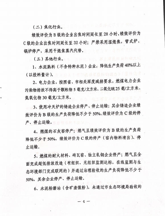 3、使用沖天爐的鑄造企業(yè)停產(chǎn)、停止運輸;其余鑄造企業(yè)績效評價為B級的生產(chǎn)負荷降低不少于50%,績效評價為C級的停產(chǎn)、停止運輸。