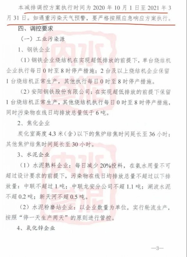 日前,河南省安陽(yáng)市龍安區(qū)發(fā)布《2020-2021秋冬季重點(diǎn)污染源減排調(diào)控方案》,要求: