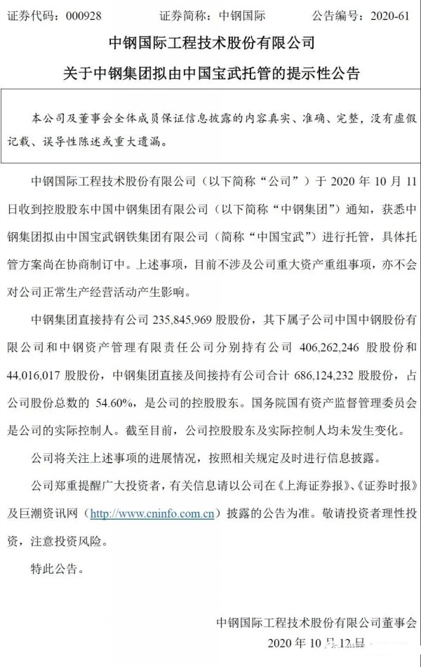 10月11日晚間,中鋼國(guó)際工程技術(shù)股份有限公司發(fā)布《關(guān)于中鋼集團(tuán)擬由中國(guó)寶武托管的提示性公告》(下簡(jiǎn)稱:《公告》),《公告》稱,中鋼國(guó)際工程技術(shù)股份有限公司(以下簡(jiǎn)稱“公司”)于2020年10月11日收到控股股東中國(guó)中鋼集團(tuán)有限公司(以下簡(jiǎn)稱“中鋼集團(tuán)”)通知,獲悉中鋼集團(tuán)擬由中國(guó)寶武鋼鐵集團(tuán)有限公司(簡(jiǎn)稱“中國(guó)寶武”)進(jìn)行托管,具體托管方案尚在協(xié)商制訂中。上述事項(xiàng),目前不涉及公司重大資產(chǎn)重組事項(xiàng),亦不會(huì)對(duì)公司正常生產(chǎn)經(jīng)營(yíng)活動(dòng)產(chǎn)生影響。