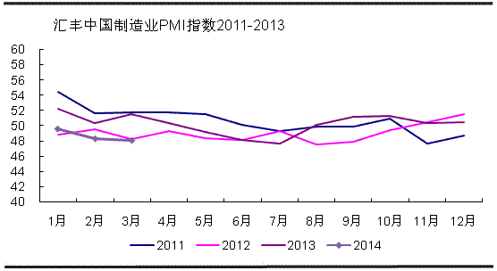 宏觀數(shù)據(jù):2014年03月24日公布的2014年03月匯豐中國制造業(yè)采購經(jīng)理人指數(shù)初值為48.1%,較2014年02月終值環(huán)比下降0.4個百分點從分項指數(shù)看,新訂單指數(shù)和產(chǎn)出指數(shù)均于榮枯線下方反季節(jié)性回落反映內(nèi)需趨冷,而兩項庫存指數(shù)均升反映企業(yè)去庫存壓力上升,兩項價格指數(shù)大幅下挫反映供需關(guān)系進一步弱化,3月PPI環(huán)比承壓。3月匯豐PMI產(chǎn)出指數(shù)初值于榮枯線下方繼續(xù)回落1.5個百分點,錄得18個月來最低值47.3%,新訂單指數(shù)亦于榮枯線下方加速萎縮,下跌1.7個百分點至47.9%,而新出口訂單指數(shù)繼續(xù)回升至榮枯線上方的51.4%,反映內(nèi)需趨冷;3月制造業(yè)產(chǎn)成品庫存和采購庫存分別上升1.1個百分點和1.3個百分點,分別錄得51.2%和49.2%,在新訂單大幅下降的前提下,兩項庫存皆升反映需求趨冷環(huán)境下企業(yè)去庫存壓力上升;值得注意的是,3月匯豐PMI產(chǎn)出和投入價格指數(shù)在萎縮區(qū)間繼續(xù)大幅下挫,分別下降4.2和5.0個百分點至40.8%和41.8%,PMI價格指數(shù)大幅下降反映供需關(guān)系進一步弱化,3月PPI環(huán)比難以改善。