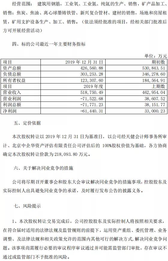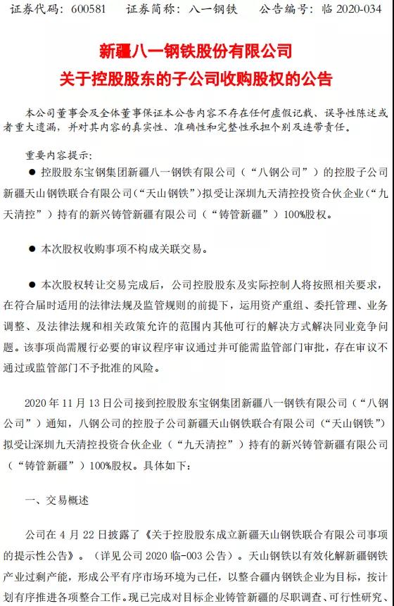 11月13日晚間,八一鋼鐵發(fā)布公告稱,該公司控股股東寶鋼集團新疆八一鋼鐵有限公司的控股子公司新疆天山鋼鐵聯(lián)合有限公司擬受讓深圳九天清控投資合伙企業(yè)持有的新興鑄管新疆有限公司100%股權。11月13日,天山鋼鐵與九天清控簽署了《股權轉讓協(xié)議》。本次股權轉讓以2019年12月31日為基準日,以公司經(jīng)天健會計師事務所審計、北京中企華資產(chǎn)評估有限責任公司評估后的100%股權價值為基礎,各方協(xié)商確定本次股權轉讓價款為21.81億元。