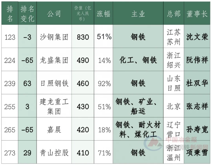 其中,共有6家鋼鐵企業(yè)上榜2020年胡潤中國500強民營企業(yè)。分別為沙鋼集團(tuán)、龍盛集團(tuán)、日照鋼鐵、建龍重工集團(tuán)、嘉晨、青山控股。詳情如下: