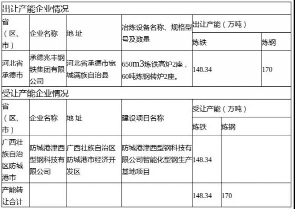 根據(jù)河北省工信廳2019年12月27日發(fā)布的《承德兆豐鋼鐵集團(tuán)有限公司產(chǎn)能出讓方案公告》,按照《國務(wù)院關(guān)于化解產(chǎn)能嚴(yán)重過剩矛盾的指導(dǎo)意見》《國務(wù)院關(guān)于鋼鐵行業(yè)化解過剩產(chǎn)能實(shí)現(xiàn)脫困發(fā)展的意見》和《鋼鐵行業(yè)產(chǎn)能置換實(shí)施辦法》要求,承德兆豐鋼鐵有限公司產(chǎn)能將出讓至廣西壯族自治區(qū)防城港市,建設(shè)防城港津西型鋼科技有限公司智能化型鋼生產(chǎn)基地項(xiàng)目,涉及煉鐵產(chǎn)能148.34萬噸、煉鋼產(chǎn)能170萬噸。詳細(xì)方案如下: