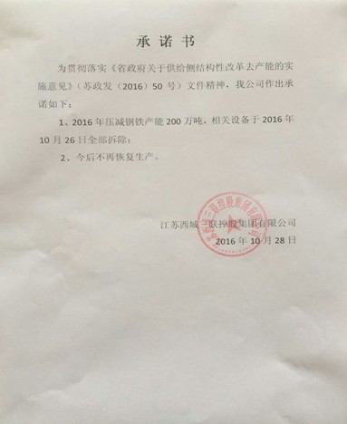 1、2016年,江蘇西城三聯(lián)控股集團(tuán)有限公司壓減煉鋼產(chǎn)能200萬噸,10月26日已將10臺40噸中頻爐拆除,企業(yè)承諾不再恢復(fù)生產(chǎn)。