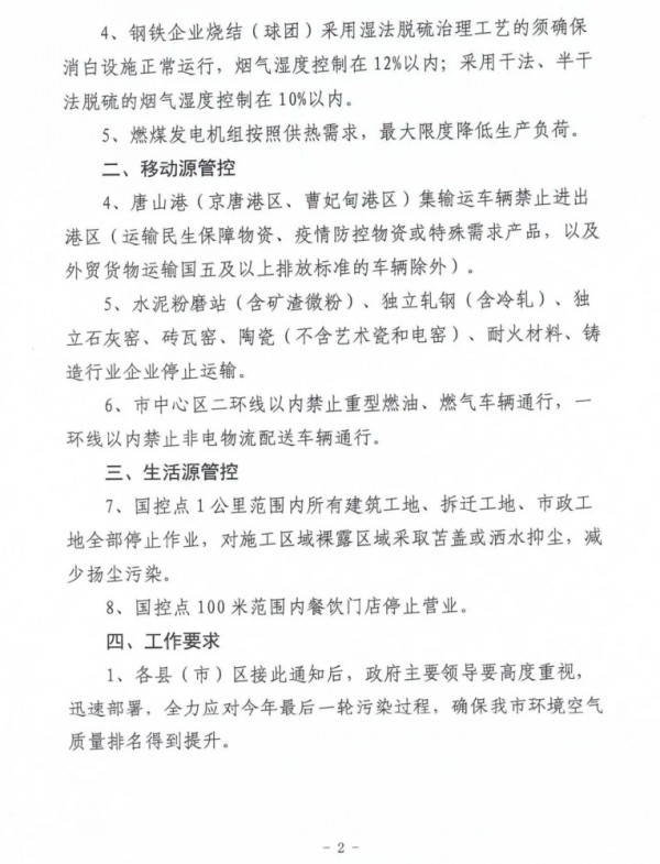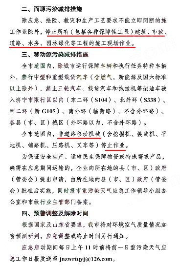 城區(qū)禁行“國Ⅲ”及以下標(biāo)準(zhǔn)機(jī)動(dòng)車;施工工地、工業(yè)企業(yè)廠區(qū)和工業(yè)園區(qū)內(nèi)停止使用國二及以下非道路移動(dòng)機(jī)械(清潔能源和緊急檢修作業(yè)機(jī)械除外);礦山(含煤礦)、洗煤廠、港口、物流(除民生保障類)等涉及大宗原料和產(chǎn)品運(yùn)輸(日常進(jìn)出量超過10輛次)的單位停止使用國四及以下重型載貨車輛(含燃?xì)廛囕v)進(jìn)行運(yùn)輸(特種車輛、?;奋囕v除外)。