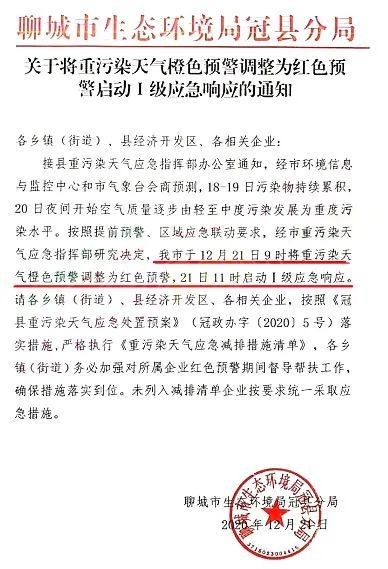 聊城市生態(tài)環(huán)境局冠縣分局發(fā)布《關(guān)于將重污染天氣橙色預(yù)警調(diào)整為紅色預(yù)警啟動(dòng)Ⅰ級應(yīng)急響應(yīng)的通知》稱自12月21日9時(shí)將重污染天氣橙色預(yù)警調(diào)整為紅色預(yù)警,21日11時(shí)啟動(dòng)Ⅰ級應(yīng)急響應(yīng)。