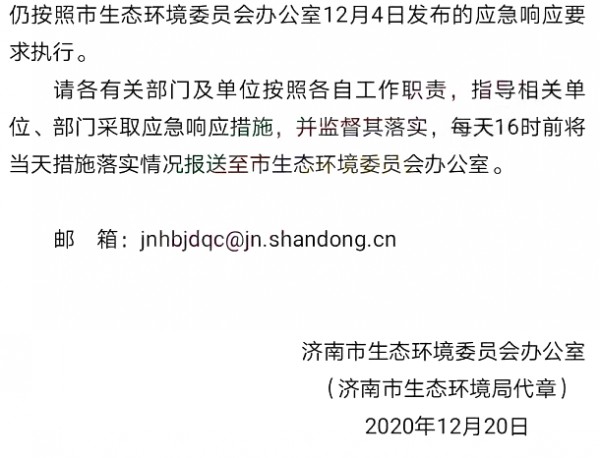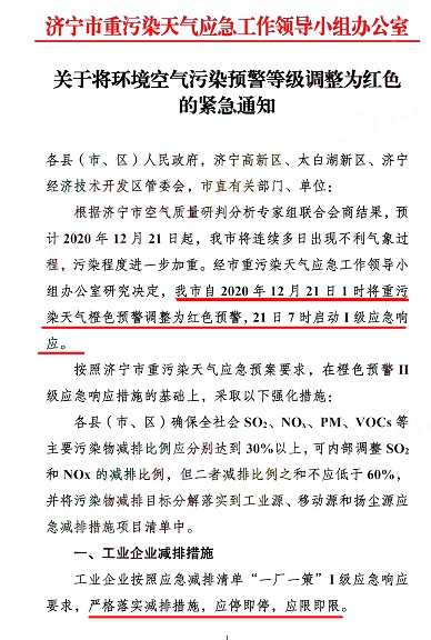 濟(jì)寧市重污染天氣應(yīng)急工作領(lǐng)導(dǎo)小組辦公室發(fā)布《關(guān)于將環(huán)境空氣污染預(yù)警等級調(diào)整為紅色的緊急通知》稱,自2020年12月21日1時(shí)將重污染天氣橙色預(yù)警調(diào)整為紅色預(yù)警,21日7時(shí)啟動(dòng)I級應(yīng)急響應(yīng)。