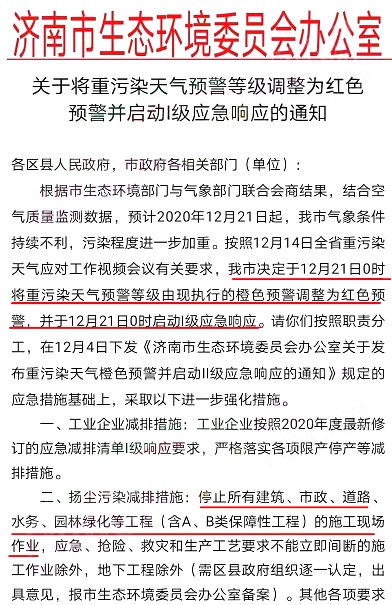 濟(jì)南市生態(tài)環(huán)境委員會辦公室通知自12月21日0時(shí)將重污染天氣預(yù)警等級由現(xiàn)執(zhí)行的橙色預(yù)警調(diào)整為紅色預(yù)警,并于12月21日0時(shí)啟動(dòng)I級應(yīng)急響應(yīng)。工業(yè)企業(yè)按照2020年度最新修訂的應(yīng)急減排清單I級響應(yīng)要求,嚴(yán)格落實(shí)各項(xiàng)限產(chǎn)停產(chǎn)等減排措施。
