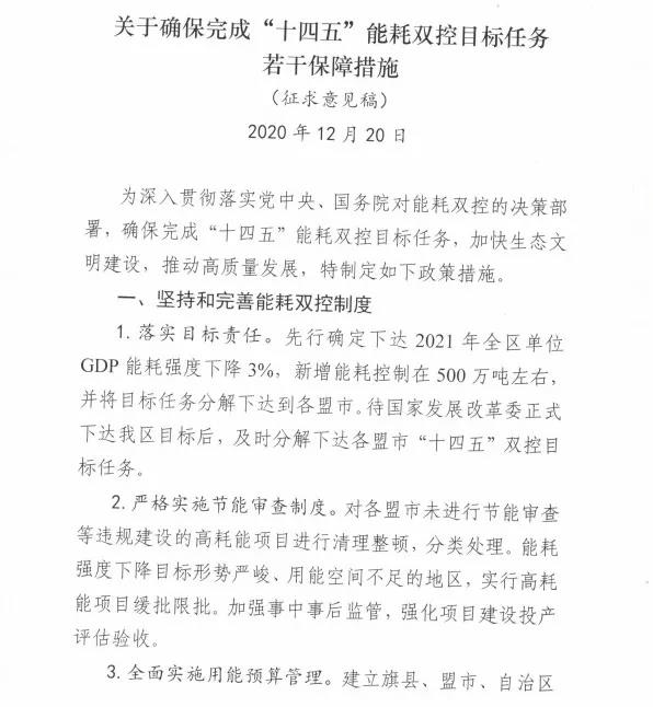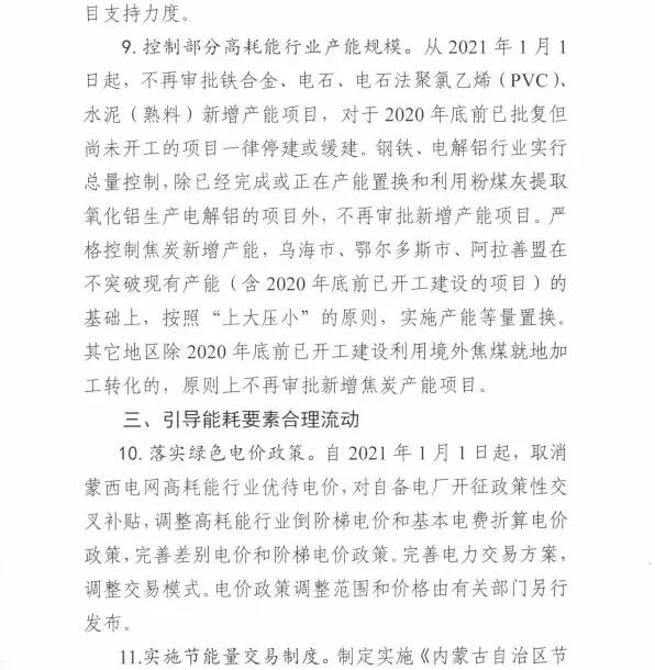 控制部分高耗能行業(yè)產(chǎn)能規(guī)模。從2021年1月1日起,不再審批鐵合金、電石、電石法聚氯乙烯(PVC)、水泥(熟料)新增產(chǎn)能項(xiàng)目,對(duì)于2020年底前已批復(fù)但尚未開(kāi)工的項(xiàng)目一律停建或緩建。鋼鐵、電解鋁行業(yè)實(shí)行總量控制,除已經(jīng)完成或正在產(chǎn)能置換和利用粉煤灰提取氧化鋁生產(chǎn)電解鋁的項(xiàng)目外,不再審批新增產(chǎn)能項(xiàng)目。嚴(yán)格控制焦炭新增產(chǎn)能,烏海市、鄂爾多斯市、阿拉善盟在不突破現(xiàn)有產(chǎn)能(含2020年底前已開(kāi)工建設(shè)的項(xiàng)目)的基礎(chǔ)上,按照“上大壓小”的原則,實(shí)施產(chǎn)能等量置換。其他地區(qū)除2020年底前已開(kāi)工建設(shè)利用外焦煤就地加工轉(zhuǎn)化的,原則上不再審批新增焦炭產(chǎn)能項(xiàng)目。
