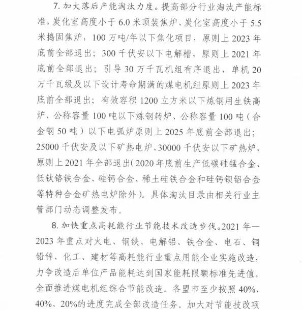 加快重點(diǎn)高耗能行業(yè)節(jié)能技術(shù)改造步伐。2021年~2023年重點(diǎn)對(duì)火電、鋼鐵、電解鋁、鐵合金、電石、銅鉛鋅、化工、建材等高耗能行業(yè)重點(diǎn)用能企業(yè)實(shí)施改造,力爭(zhēng)改造后單位產(chǎn)品能耗達(dá)到國(guó)家能耗限額標(biāo)準(zhǔn)先進(jìn)值。全面推進(jìn)煤電機(jī)組綜合節(jié)能改造。各盟市至少按照40%、40%、20%的進(jìn)度完成全部改造任務(wù)。加大對(duì)節(jié)能技改項(xiàng)目支持力度。