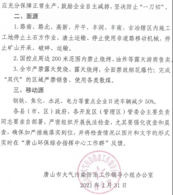 1月31日,唐山市大氣污染防治工作領(lǐng)導(dǎo)小組辦公室發(fā)布《關(guān)于進一步加嚴源頭減排措施的緊急通知》。按照該通知,自1月31日14時開始,唐山減排量增至50%,燒結(jié)機全面停限產(chǎn)。