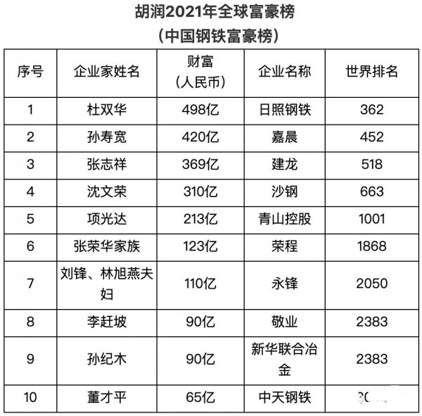 而上榜的中國(guó)鋼鐵首富則是日照鋼鐵的杜雙華,排在前十的還有嘉晨集團(tuán)的孫壽寬、建龍集團(tuán)的張志祥、沙鋼集團(tuán)的沈文榮、青山控股的項(xiàng)光達(dá)等,詳情見下表!