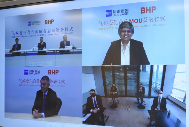 河鋼集團(tuán)是全球鋼鐵領(lǐng)軍企業(yè)之一,必和必拓是世界知名的礦產(chǎn)資源公司和重要的鋼鐵冶煉原材料供應(yīng)商,雙方在多個領(lǐng)域都建立了長期且持續(xù)的合作關(guān)系。雙方均意識到氣候變化給鋼鐵行業(yè)及其價值鏈帶來的挑戰(zhàn),并致力于在共同應(yīng)對氣候變化方面承擔(dān)相應(yīng)的企業(yè)責(zé)任和義務(wù)。應(yīng)對氣候變化是人類共同的事業(yè)。3月5日,世界鋼鐵協(xié)會主席、河鋼集團(tuán)黨委書記、董事長于勇與必和必拓首席執(zhí)行官韓慕睿(Mike Henry)圍繞減碳與氣候變化以及進(jìn)一步加強(qiáng)雙方在低碳冶金等領(lǐng)域合作等議題進(jìn)行視頻交流,會上,雙方視頻簽署共同應(yīng)對氣候變化戰(zhàn)略合作諒解備忘錄,河鋼集團(tuán)副總經(jīng)理王新東和必和必拓首席商務(wù)官潘文怡(Vandita Pant)代表雙方簽約。河鋼集團(tuán)副總經(jīng)理劉鍵主持簽約儀式。