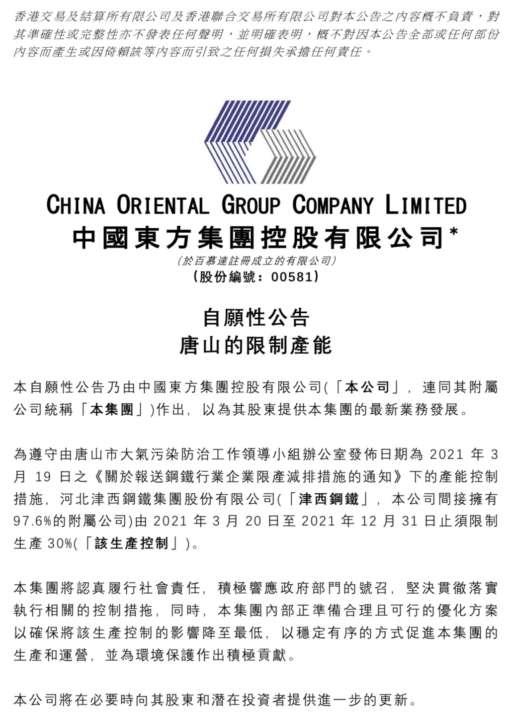 公告表示,集團(tuán)將認(rèn)真履行社會(huì)責(zé)任,積極響應(yīng)政府部門的號召,堅(jiān)決貫徹落實(shí)執(zhí)行相關(guān)的控制措拖,同時(shí),集團(tuán)內(nèi)部正準(zhǔn)備合理且可行的優(yōu)化方案以確保將該生產(chǎn)控制的影響降至最低,以穩(wěn)定有序的方式促進(jìn)集團(tuán)的生產(chǎn)和運(yùn)營,并為環(huán)境保護(hù)作出積極貢獻(xiàn)。